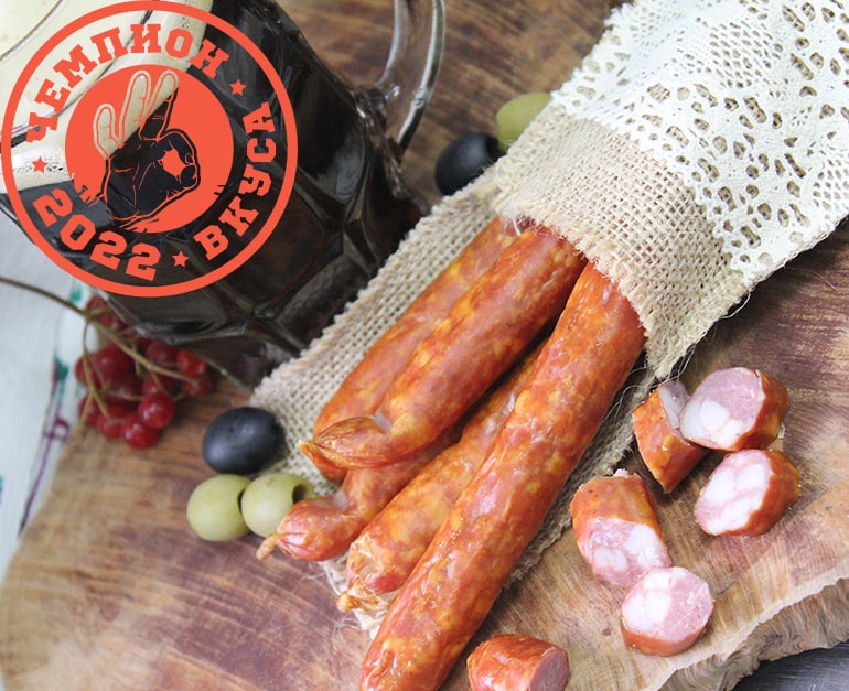 Состав:свинина, говядина, вода питьевая, пищевая добавка(соль поваренная пищевая йодированная, фиксатор окраски Е250), соль поваренная пищевая йодированная, комплексная пищевая добавка (декстроза, пряности молотые, соль, усилитель вкуса и аромата Е621, сахар, антиокислитель Е316), комплексная пищевая добавка (экстракты натуральных пряностей, стабилизатор Е450, паприка, регулятор кислотности глюконодельталактон, антиокислитель аскорбат натрия, соль), натуральный ароматизатор (декстроза, экстракты натуральных пряностей), чеснок.