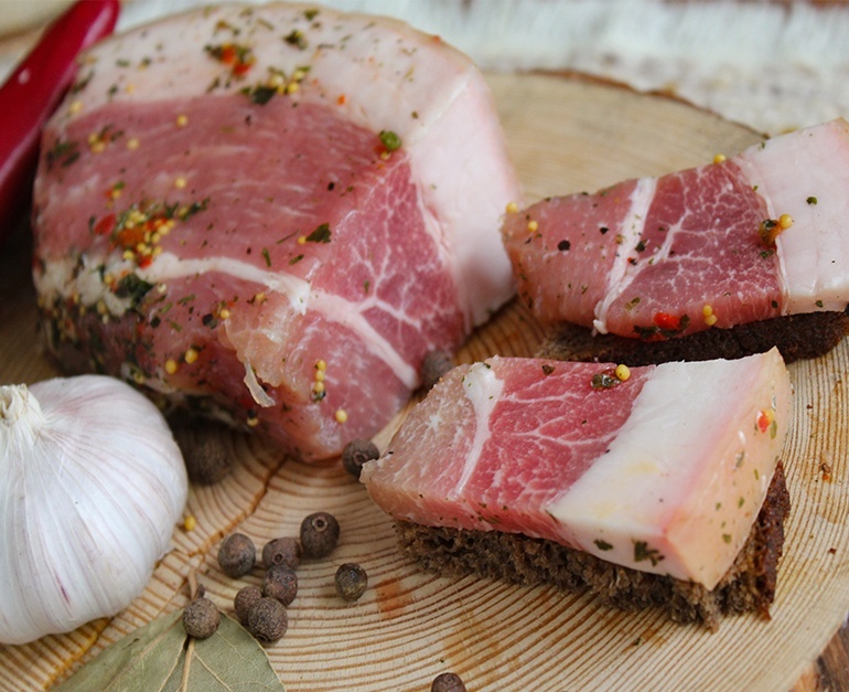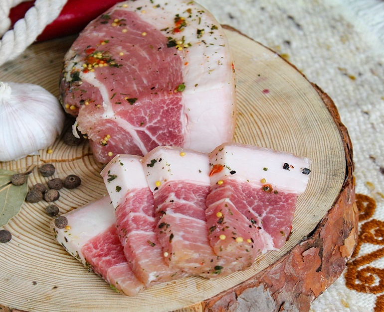 Окорок «Вясковый Люкс» — соленый продукт из свинины. Окорок изготавливается традиционным для Полесья способом — сухим посолом с добавлением натуральных специй и пряностей. Мы используем свежее мясо, выращенное в Крестьянском хозяйстве на натуральных кормах. Состав: окорок свиной, соль, тмин, горчичное семя, лук, петрушка, паприка, перец черный